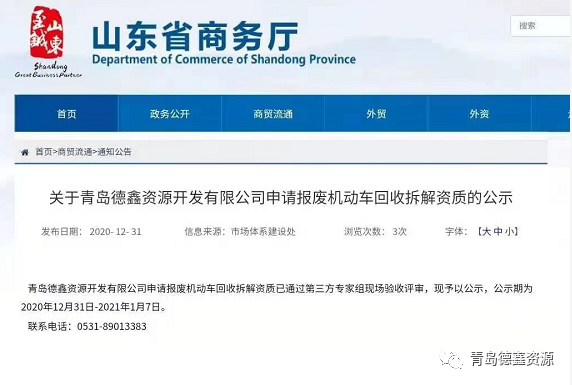 于2021年1月19日由山東省商務(wù)廳頒發(fā)報(bào)廢機(jī)動車回收拆解企業(yè)資質(zhì)認(rèn)定證書。
